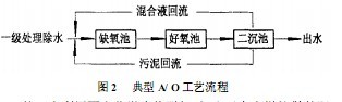 在含氮廢水的處理中,常規(guī)活性污泥法對(duì)一般有機(jī)物的去除率可以達(dá)到90%以上,但由于工藝過程中幾乎不發(fā)生硝化作用,總凱氏氮的去除率僅在10%~30%之間。近年來國內(nèi)外水環(huán)境標(biāo)準(zhǔn)的嚴(yán)格化,促使人們對(duì)活性污泥法進(jìn)行工藝流程的改進(jìn),出現(xiàn)了A/O生物脫氮工藝等污水處理新工藝(工藝流程見圖2)。但該工藝仍然存在著諸如硝化菌群增殖速度慢、抗金屬及有機(jī)物沖擊的能力不強(qiáng)等缺點(diǎn)。