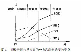本工藝主要是利用擴(kuò)散阻力在顆粒內(nèi)部產(chǎn)生的氧濃度梯度形成的好氧區(qū)、缺氧區(qū)和厭氧區(qū),在載體內(nèi)部形成了適合硝化和反硝化兩個(gè)過程有機(jī)結(jié)合的環(huán)境,在顆粒污泥表層由于氧的存在而進(jìn)行氨的氧化反應(yīng),顆粒內(nèi)部因?yàn)槿毖鯒l件下利用氨的氧化產(chǎn)物進(jìn)行反硝化反應(yīng),從而實(shí)現(xiàn)單級(jí)生物脫氮。詳見圖4。