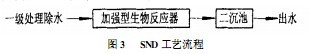 然而在利用固定化微生物脫氮時(shí),由于存在樣擴(kuò)散的限制,在固定化細(xì)胞顆粒、生物膜、細(xì)胞聚集體中存在著好氧區(qū)和缺氧區(qū)或厭氧區(qū)。這樣,硝化菌的產(chǎn)物可作為反硝化菌的底物,硝化和反硝化兩階段反應(yīng)即可在同一反應(yīng)器中完成,實(shí)現(xiàn)同時(shí)硝化和反硝化(SND)。這種改進(jìn)工藝流程見圖3。由于省去了第二階段的厭氧反硝化池或減少其尺寸,從而大大簡(jiǎn)化了生物脫氮的工藝流程。