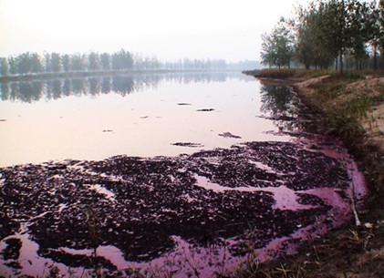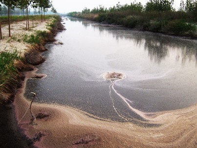 “三北防護林”內大片污水成湖,黑醬油一樣的污水 翻騰,漂浮著紅黑色泡沫,散發(fā)出陣陣惡 |