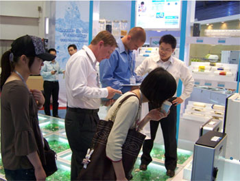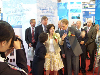 2008年5月21日9:30,Aquatech China 2008正式開幕。開幕儀式后,主禮嘉賓——荷蘭交通公共工程水管理部副部長惠辛格女士等一行首先來到美的展位,并接受了鳳凰衛(wèi)視的采訪。開館后人潮簇擁,紛紛走上鋪滿草地、珊瑚、貝殼的透明的美的展臺,零距離參觀美的凈水機08全新產(chǎn)品,特別是紅、黑兩款凈水制冰機,更是謀殺了無數(shù)菲林。美的凈水機憑籍直飲機、管道超濾、廚房凈水機、管線機、軟水機五大系列近百款的超強大產(chǎn)品陣容,一舉成為全場最閃亮最矚目的“明星”。