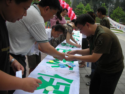 8月20日上午12時(shí),“綠色環(huán)保、人文奧運(yùn)” 千人簽字換取環(huán)保袋活動(dòng)在上地嘉華大廈隆重舉行。此次活動(dòng)是六合天融(北京)環(huán)?萍加邢薰、金隅嘉華物業(yè)管理公司與谷騰環(huán)保網(wǎng)聯(lián)合主辦的“綠色奧運(yùn)征文活動(dòng)”當(dāng)中的一部分,掀起了征文活動(dòng)新的高潮。