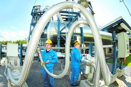 ![]() 兩名工人在“零污染”火力發(fā)電站的液體二氧化碳運(yùn)輸管道前工作 |