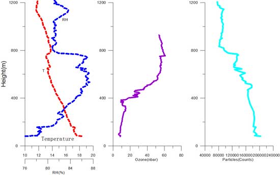 附圖:無人機探測的溫度、濕度、臭氧和粒子濃度廓線