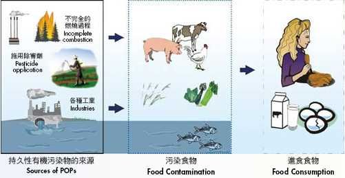雖然POPs不溶于水,但極易被脂肪組織吸收而放大到原始值的7萬(wàn)倍。魚類、猛禽、哺乳動(dòng)物以及人類等由于處于食物鏈頂端,因此會(huì)大量吸收POPs。這些POPs被認(rèn)為是通過(guò)食物、飲水或呼吸等進(jìn)入人體并在人體脂肪組織中積累下來(lái)的。因此,要特別注意微量的POPs物質(zhì)通過(guò)動(dòng)物性食品或其他高脂肪含量的食品被攝入體內(nèi)。