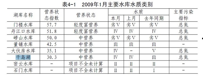 在《2009年1月主要水庫水質類別》的表中,顯示千島湖本月水質Ⅳ類,主要污染指標為總氮。