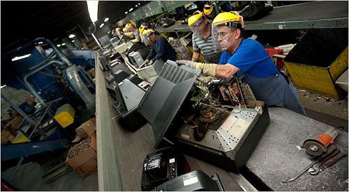 ![]() 在西雅圖的綜合回收所里,工人們正在分拆廢棄的電視、電腦等物品。這家綜合回收所于2009年一月指定為回收廢棄電器的機構。 |