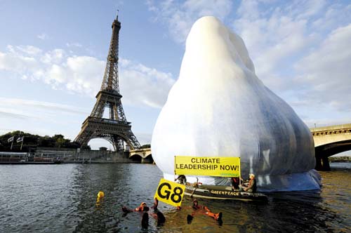 ![]() 環(huán)境保護(hù)者在埃菲爾鐵塔前放了一個巨大的“冰山”,呼吁關(guān)注氣候問題 |