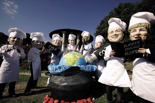 ![]() 示威者裝扮成大廚的樣子,手持各種調(diào)料烹煮地球這道菜,這些調(diào)料中有二氧化碳等內(nèi)容 |