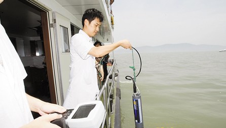 圖為在太湖監(jiān)測一號船上,工作人員正對水質(zhì)進行實時檢測。