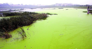| 桃花西湖的湖面上出現(xiàn)大面積浮萍 |