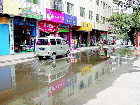 近日,蜀西路76號(hào)某汽車市場(chǎng)門口,400米長(zhǎng)的慢車道上大量積水,最深處達(dá)20余厘米。不僅行人無(wú)法在人行道上通過(guò),就連電瓶車、自行車也不得不小心翼翼地在水中行駛。9月14日,記者了解到,造成積水的根本原因在于該路段修建時(shí)未建設(shè)地下排污管網(wǎng),路邊排洪溝無(wú)法滿足雨季來(lái)臨后的雨污水排泄需要。