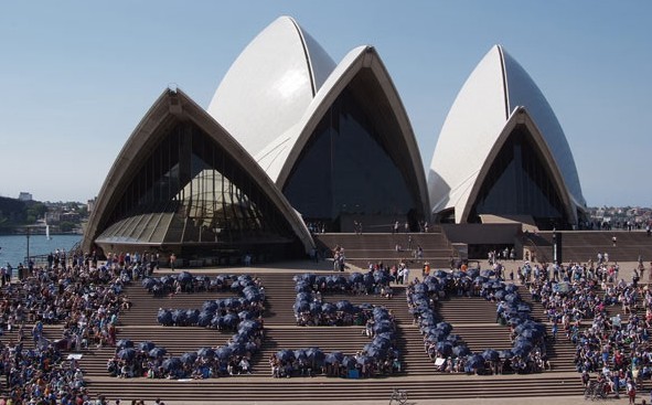 澳大利亞悉尼歌劇院前,人們打著深藍色太陽傘坐在地上,用阿拉伯?dāng)?shù)字擺出一個巨大的“350”;在孟加拉國首都達卡,3名身著民族服裝的婦女站成一排,每人懷中抱著一個具有當(dāng)?shù)靥厣纳詈稚蠊拮,上面分別寫有3、5、0三個數(shù)字;美國佛蒙特州,一些環(huán)保人士懸掛在巖壁上,形成立體狀 “350”;澳大利亞大堡礁和馬爾代夫,人們分別在水下展開印有“350”的橫幅;菲律賓宿務(wù)市的小朋友也站在空地上,集體用身體擺出“350”字樣……