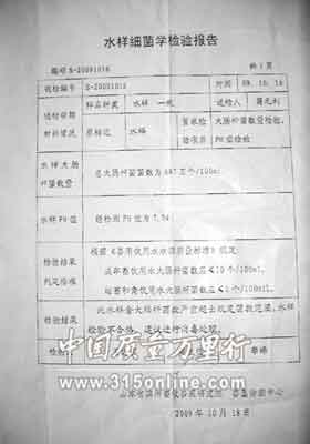 | 濱州市畜牧獸醫(yī)研究院出具的檢驗報告顯示,“(地下)水樣不合格”。 |