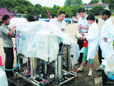 吳豐昌研究員在野外指導博士生和博士后進行湖泊大體積水樣的現(xiàn)場過濾、濃縮和富集實驗研究。