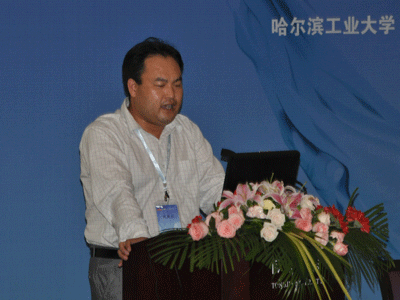 圖為來自中水源膜技術有限公司的王洪聲博士在作《PVC合金多孔膜及其在市政水處理中的應用》主題演講。