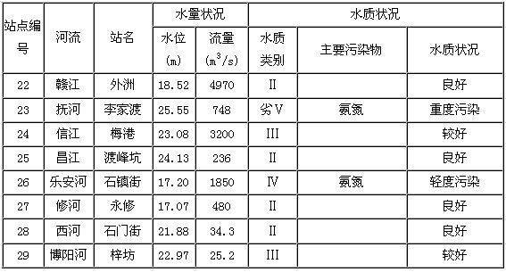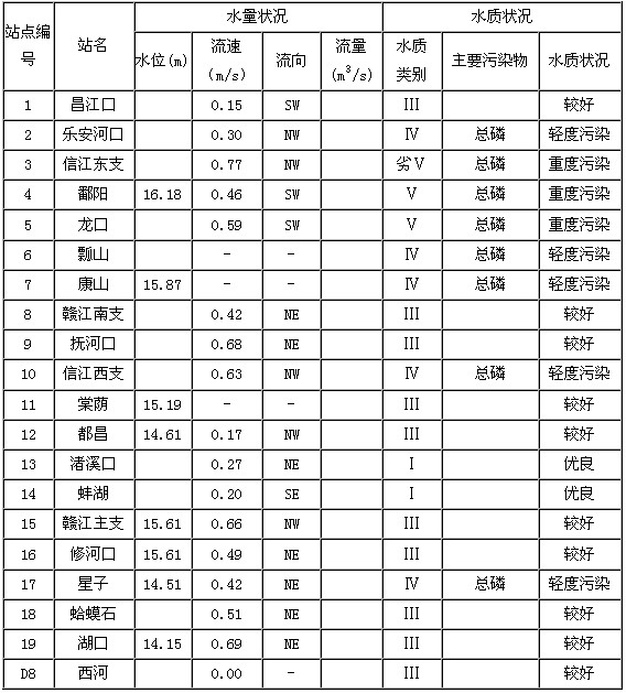 入湖江河水質(zhì)較上期有所下降。各河狀況具體為:贛江外洲站流量4970m3/s,占入湖合成流量的43.1%,水質(zhì)良好,為Ⅱ類水,水質(zhì)類別較上期上升1個等級;撫河李家渡站流量748m3/s,占6.5%,水質(zhì)明顯下降,為劣Ⅴ類水,受到重度污染,主要超標(biāo)項目為氨氮,水質(zhì)類別較上期下降3個等級;信江梅港站流量3200m3/s,占27.7%,水質(zhì)較好,為Ⅲ類水,水質(zhì)類別較上期下降1個等級;昌江渡峰坑站流量236m3/s,占2.0%,水質(zhì)良好,為Ⅱ類水,水質(zhì)類別較上期上升1個等級;樂安河石鎮(zhèn)街站流量1850m3/s,占16.0%,水質(zhì)受到輕度污染,為Ⅳ類水,水質(zhì)類別較上期上升1個等級,主要超標(biāo)項目為氨氮;修河永修站流量480m3/s,占4.2%,水質(zhì)良好,為Ⅱ類水,水質(zhì)類別與上期相同;西河石門街站流量34.3m3/s,占0.3%,水質(zhì)良好,為Ⅱ類水,水質(zhì)類別與上期相同;博陽河梓坊站流量25.2m3/s,占0.2%,水質(zhì)較好,為Ⅲ類水,水質(zhì)類別較上期下降1個等級。各河控制斷面水質(zhì)詳見表一。