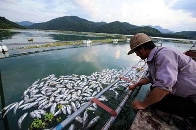 ![]() 養(yǎng)殖戶在棉花灘水庫(kù)查看因紫金礦業(yè)污染事故致死的網(wǎng)箱魚(yú) |