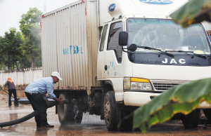 | 17日下午,正在溫泉山莊買(mǎi)水的罐裝車(chē) |