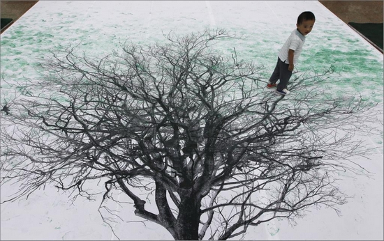 無(wú)車日儀式上,孩子在“環(huán)保樹海報(bào)”上踩下綠色足跡 |