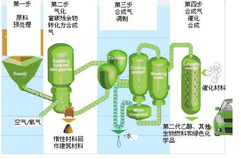 在Enerkem工藝中,垃圾被破碎,并在鼓泡式流化床中在“低苛刻度”(750–800°C和常壓)下進行氣化,苛刻度逐段增大,生成合成氣,主要由一氧化碳和氫氣細成。通過旋分器去除顆粒物質(zhì),然后使合成氣經(jīng)水洗、壓縮和通過專有的催化工藝而被轉化,生成甲醇、醋酸酯,最終生成乙醇。到 2011年初,Enerkem公司將開始在美國密西西比州Pontotoc建設類似的裝置,美國能源部將資助5000萬美元。