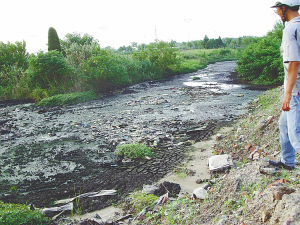 記者發(fā)現(xiàn),兩個坑塘水質(zhì)不同,東邊的水黑,有臭味,很多蘆葦枯死,而西邊的水較清,蘆葦長得也好,就問村民是怎么回事?村民反映:從前年秋天起,在磚瓦廠承包老板的操辦下,有人從外地把一船船“黑灰”運到附近碼頭,然后又用汽車把“黑灰”運過來倒進東邊塘里,幾年下來,已倒進上萬噸,直到前不久大家向環(huán)保部門反映,向坑塘倒“黑灰”的行為才被制止。