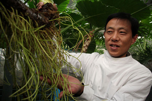 污水處理廠的技術(shù)人員在生態(tài)溫室內(nèi)觀看滴水觀音水生根的長(zhǎng)勢(shì)情況。