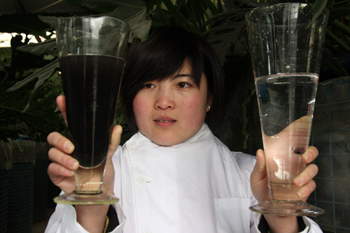 污水處理廠的技術(shù)人員在生態(tài)溫室內(nèi)對(duì)處理前后的礦井污水進(jìn)行觀測(cè)比較 |