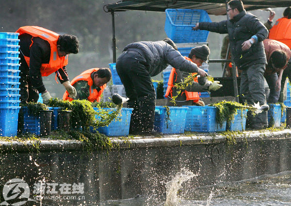 1月10日,杭州西湖浴鵠灣水域,綠化工人將一筐筐菹草均勻地拋到西湖水底。西湖水域管理處去年在西湖水域已經(jīng)種植了七、八千平方米菹草,用于增強(qiáng)西湖自身凈化能力,美化西湖環(huán)境。