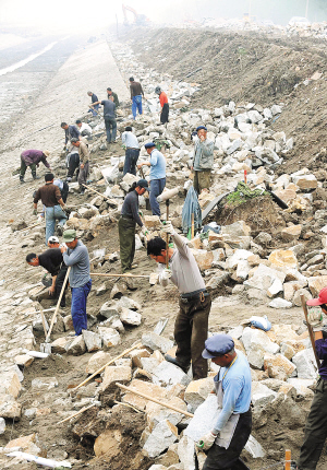 | 5月5日郎園引河治理工程建設者在進行河道護砌施工。 |