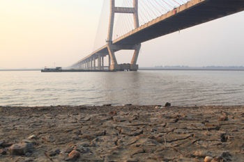 | 圖為2010年12月10日在江西省湖口縣境內(nèi)的鄱陽湖大橋附近岸邊拍攝的已經(jīng)干涸開裂的湖灘。 |