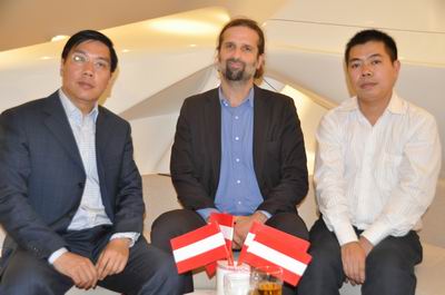 是能公司公司總裁Andreas先生(中)中國區(qū)商務(wù)經(jīng)理肖力(左)接受谷騰網(wǎng)專訪 |