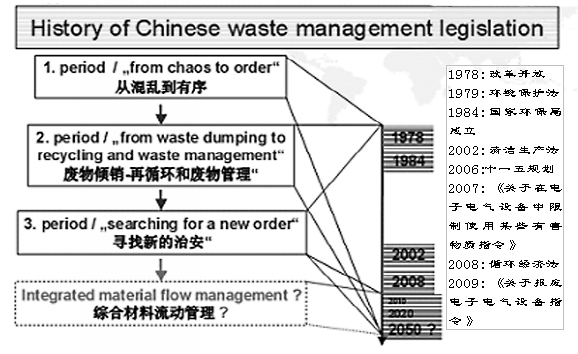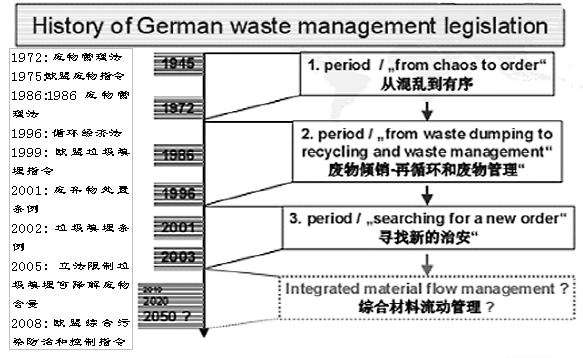 1945年~1996年,德國經(jīng)過50年的發(fā)展,終于建立了循環(huán)經(jīng)濟法律制度,并取得了垃圾處理方面的優(yōu)秀成果。預計到2020年實現(xiàn)一些綜合材料的流動管理,為落實此計劃,歐盟和德國頒布了一系列垃圾處理相關(guān)法規(guī)。