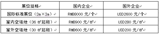 備注:標準展位包括下列設施:三面白色圍板、一塊公司名稱楣板、一張洽談桌、兩把椅子、兩盞射燈、一只220V/5A電源插座、地毯;室內(nèi)及室外空場地不含相關配置。