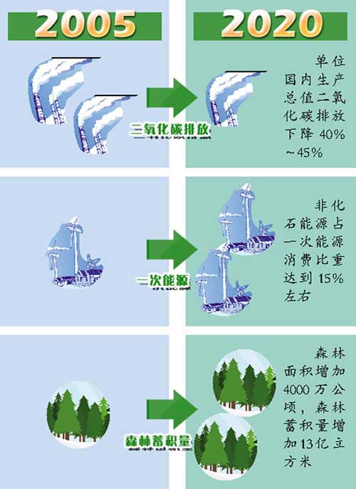 9月22日,胡錦濤主席在聯(lián)合國氣候變化峰會開幕式上就共同應對氣候變化提出4項主張。11月25日,我國宣布到2020年,單位國內生產(chǎn)總值二氧化碳排放比2005年下降40%~45%。