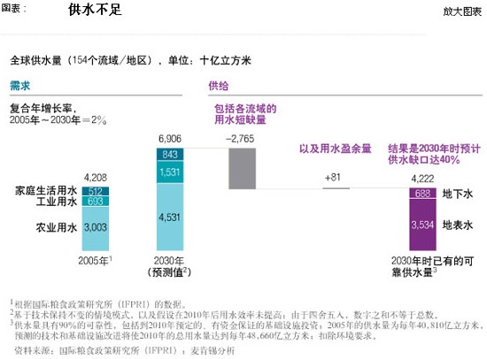 許多國家都面臨它們能可靠地為其經(jīng)濟提供的水量與其實際需求量之間越來越大的差距。假設(shè)經(jīng)濟和人口持續(xù)增長下去,到2030年,全球供水能力將只能滿足需求量的60%(圖表),而在許多發(fā)展中地區(qū),滿足率還不到50%,這些地區(qū)(包括中國、印度和南非)目前的供水已處于緊張狀態(tài)。以增加供給的方式——通過脫鹽淡化、鉆探深井,或運送地表水——來彌合供求差距將極其困難和昂貴。更有可能的是,政府將需要通過提高水價或限定用戶取水量來管理用水需求。
