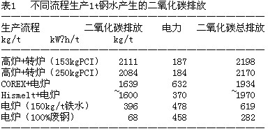 1.2 鋼鐵工業(yè)不同生產(chǎn)流程二氧化碳排放差異(見表1)
