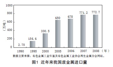 我國(guó)金屬進(jìn)口早期主要為銅(鋁)精礦和粗銅(鋁)等原料,從20世紀(jì)90年代初期開始進(jìn)口廢金屬,主要包括以回收銅、鋁為主的廢電機(jī)、廢電線電纜、廢五金電器等。隨著廢金屬拆解、利用技術(shù)的提高以及由此產(chǎn)生的顯著經(jīng)濟(jì)效益,加之國(guó)內(nèi)回收的廢金屬數(shù)量較小,廢金屬進(jìn)口量近幾年迅速增加。數(shù)據(jù)表明,我國(guó)廢金屬進(jìn)口量從1990年的2.75萬噸增加至 2008年的772.7萬噸,增長(zhǎng)近300倍(見圖1)。中國(guó)已成為全球廢金屬進(jìn)口大國(guó)。