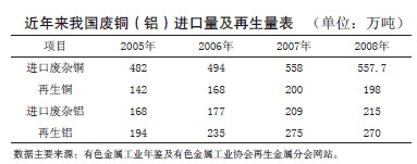 進(jìn)口廢金屬拆解及利用產(chǎn)業(yè)對(duì)促進(jìn)我國(guó)再生金屬產(chǎn)業(yè)發(fā)展起到了重要作用。2005-2008年國(guó)內(nèi)廢銅、廢鋁進(jìn)口量和再生銅、再生鋁產(chǎn)量見下表。按廢銅含銅20%、廢鋁含鋁60%估算,2008年,進(jìn)口廢銅可產(chǎn)出112萬噸銅,占當(dāng)年再生銅的57%,進(jìn)口廢鋁可產(chǎn)出鋁129萬噸,占當(dāng)年再生鋁的48%。2008年,國(guó)內(nèi)再生銅利用量約200萬噸,居世界第一位;再生鋁利用量約300萬噸,居世界第二位;再生金屬產(chǎn)量突破600萬噸,產(chǎn)值2209億元,從業(yè)人員達(dá)到150萬人,整體規(guī)模處于世界領(lǐng)先水平。