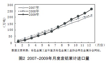 進(jìn)入2009年以后,在國(guó)家相關(guān)部門指導(dǎo)下,國(guó)內(nèi)廢金屬拆解利用行業(yè)積極應(yīng)對(duì)挑戰(zhàn),克服重重困難,恢復(fù)生產(chǎn),度過難關(guān)。對(duì)比分析2007、2008、2009三年中月度累計(jì)廢金屬進(jìn)口量可以發(fā)現(xiàn)(見圖2),2009 年6月份以后,進(jìn)口量明顯回升,廢鋁進(jìn)口已經(jīng)率先回歸金融風(fēng)暴前的高速道路,這也昭示了我國(guó)廢金屬拆解利用產(chǎn)業(yè)開始回暖、重新崛起。廢金屬拆解利用產(chǎn)業(yè)將繼續(xù)為我國(guó)循環(huán)經(jīng)濟(jì)和節(jié)能減排事業(yè)發(fā)展做出重要貢獻(xiàn)。