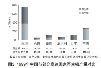盡管我國(guó)金屬再生產(chǎn)業(yè)近幾年得到了很大發(fā)展,但與國(guó)外發(fā)達(dá)國(guó)家相比仍有較大差距。以再生鋁為例(見圖3所示),1999年,再生鋁產(chǎn)量占總鋁產(chǎn)量的比重,美國(guó)為49.4%、英國(guó)為48.7%、德國(guó)為43.2%、意大利為72.8%、日本為99.1%,而我國(guó)僅為7.5%。2005 年我國(guó)再生鋁所占比重為22.9%,雖有大幅提升,但與發(fā)達(dá)國(guó)家的平均水平相比,差距依然十分明顯。