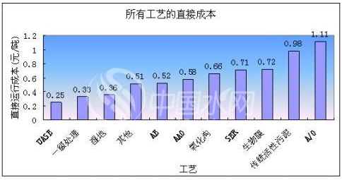 據(jù)中國水網(wǎng)年度報告分析,所有工藝中,A/O工藝的直接運行成本最高,傳統(tǒng)活性污泥次之,生物膜的直接運行成本第三。UASB工藝的運行成本最低,但全國直接就采用UASB工藝的僅一家污水廠,一些污水處理廠將厭氧與好氧聯(lián)合應(yīng)用,可兼兩種工藝的優(yōu)點。污水廠的直接運行成本與進出水的水質(zhì)等因素也有關(guān)系,對各種運行工藝的運行成本分析只是作為一個參考,并不能直接衡量工藝的經(jīng)濟性。