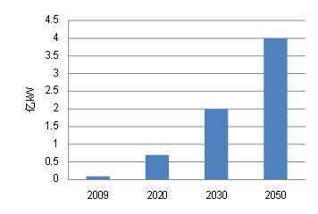 風電:近年來裝機容量每年翻一番,2009年,中國累計風電裝機達2580萬kW,其中風電并網(wǎng)總容量1613萬kW,占全國發(fā)電設備容量的1.85%(截至2009年底,全國電力裝機總容量累計達8.74億kW);而風力發(fā)電量269億kWh,僅占全國發(fā)電量的0.737%(2009年,全國發(fā)電量36506億kWh)[2]。若2020年風力發(fā)電的裝機容量達到1億kW,考慮到每單位裝機容量的滿負荷年運行小時數(shù)平均為2000小時,則風力發(fā)電量為2000億kWh,估計2020年全面實現(xiàn)小康社會總用電量將達到6.6萬億kWh,也就是2020年在理想情況下我國風電量約占全社會總用電量的3%。這是除水電外最大的可再生能源電的份額。