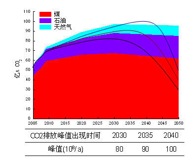 與圖5最可能發(fā)展情景對應,考慮煤、石油、天然氣對我國CO2排放的貢獻(圖6)。天然氣屬于低碳的能源,排氣中CO2濃度低,進一步收集難度大。石油的排放源比較分散,難以實現(xiàn)大規(guī)模收集。且天然氣和石油利用中的CO2排放在總的CO2排放中所占份額較小。所以減排CO2的重任要落在煤上。對我國CO2排放峰值出現(xiàn)時間和絕對值進行假設,譬如2030年80億t,2035年90億t,2040年100億t,圖6中的三條曲線分別代表了三種峰值到出現(xiàn)的情景,各條曲線以上的部分表示在已經(jīng)大力強化節(jié)能和發(fā)展核能和可再生能源的條件下,仍需要減排的部分。