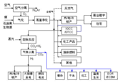 如果煤直接燃燒,從煙氣里收集CO2很困難,因為煙氣中CO2濃度低(煙囪里CO2的濃度大約13~14%,70~80%都是氮氣)、壓力低、處理的煙氣體積流量大,能耗大(分離過程是耗能過程)。依靠目前的技術,將發(fā)電廠煙囪里的CO2分離出來,處理后埋入地下,整個燃煤發(fā)電效率會降低11個百分點,如原來發(fā)電效率是45%,則加上CO2捕捉環(huán)節(jié)會降為34%。由于發(fā)電效率的降低,要得到相同的電量就需要消耗更多的煤。在IGCC多聯(lián)產(chǎn)系統(tǒng)中,從煤氣化后的合成氣中捕捉(Capture)高濃度、高壓的CO2,為減排CO2創(chuàng)造條件,雖然也要耗能,但是效率降低大概為6~7個百分點。所耗費的能量與成本比常規(guī)電站煙氣中捕捉CO2低得多,且IGCC多聯(lián)產(chǎn)系統(tǒng)有多種產(chǎn)品,在成本方面可以實現(xiàn)互補,能量可以得到綜合利用,又能夠提供較低成本的CO2的去除辦法。因此"IGCC+多聯(lián)產(chǎn)+CCUS"是中國CO2減排的戰(zhàn)略方向。