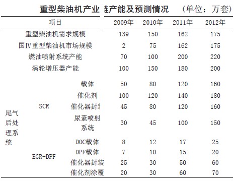 2010年將實(shí)施柴油機(jī)國IV標(biāo)準(zhǔn),目前重型柴油機(jī)生產(chǎn)企業(yè)已有近139種國Ⅳ產(chǎn)品通過了環(huán)保型式核準(zhǔn),主要采用高壓共軌/單體泵+選擇性催化還原(SCR)尾氣后處理技術(shù)。產(chǎn)能方面,以2008年129萬臺重型柴油機(jī)產(chǎn)量為基數(shù),預(yù)計(jì)2010-2012年市場需求量將分別達(dá)到 150萬臺、162萬臺和175萬臺。重型柴油機(jī)尾氣后處理裝置技術(shù)成熟,但由于政策不明朗,企業(yè)未積極擴(kuò)大產(chǎn)能。相關(guān)產(chǎn)業(yè)鏈的產(chǎn)能及預(yù)測情況見下表。