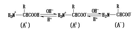 所有的氨基酸都同時(shí)含有羧基和氨基,是一種兩性物質(zhì)。在溶液中的帶電狀態(tài),隨著溶液的pH值而改變。帶有一氨基和一羧基的α-氨基酸隨pH值的離子形態(tài)變化如下: