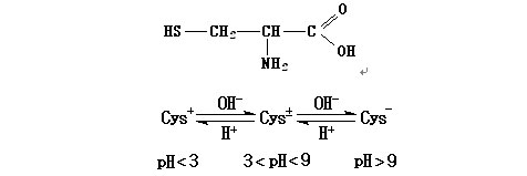 L-半胱氨酸(Cys)微溶于水,象其他氨基酸一樣是一種兩性離子,在水溶液中氨基和羧基在不同pH下離解。