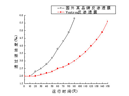 從圖2可以看出,Vontron反滲透膜元件與國(guó)外某品牌反滲透膜元件相比,對(duì)L-半胱氨酸脫除率的衰減明顯緩慢,膜元件的使用壽命更長(zhǎng)。