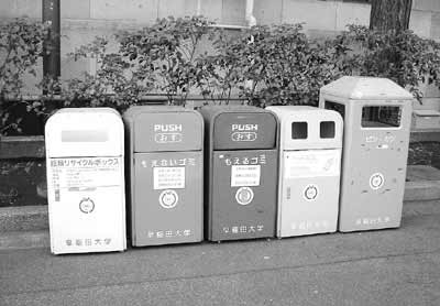 對(duì)于生活中的大件垃圾,如沙發(fā)、柜子或冰箱等電器,則需住戶事先到垃圾清掃所或商場(chǎng)、便利店去買不同數(shù)額的專門的處理券,貼到這些大件垃圾上,并與垃圾清掃所聯(lián)系約定回收的時(shí)間,否則是不允許隨便搬到路邊的。有的住戶還會(huì)將不用的家具擺在自家門前一個(gè)不妨礙通行的角落,標(biāo)明可以由路人自由取用,如果沒(méi)人搬走,再去按大件垃圾處置?梢哉f(shuō),在日本的各個(gè)地鐵電車車站、大小商店、公路休息站,只要是設(shè)置了垃圾箱的,就一定是按不同種類和目的進(jìn)行分類的,但在街道的大多地方卻很少有垃圾箱,于是便有相當(dāng)多的人會(huì)把外出時(shí)的垃圾帶回自己的家,再分類處理。
